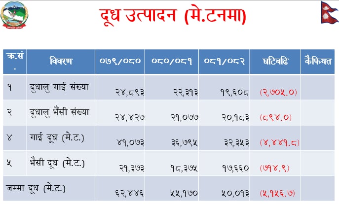 “आ.व.०७८/७९ मा ६१ हजार छ सय ६४ मेट्रिक टन दूध उत्पादन भएकोमा आ.व ०७९/८० मा थप वृद्धि भई ६२ हजार चार सय ४६ मेट्रिक टन उत्पादन भएको थियो । तर गत आ.व. ०८०/८१ मा विगतको भन्दा घटेर जम्मा ५५ हजार एक सय ७० मेट्रिक टन दूध उत्पादन भएको छ थियो । गत आ.व.मा अझ घटेर ५० हजार १३ मेट्रिक टन दूध उत्पादन भएको छ”,उहाँले भन्नु भयो ।
