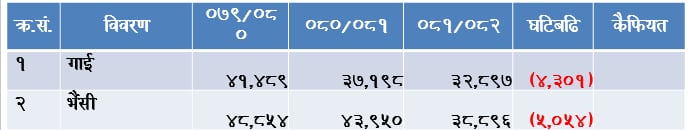 गत आ.व.मा गाई को सङ्ख्या ३२ हजार आठ सय ९७ रहेको छ भने भैँसी को सङ्ख्या ३८ हजार आठ सय ९६ रहेको छ । यसरी तीन वर्षको तथ्याङ्क हेर्दा प्रत्येक वर्ष सरदर चार हजारको दरले गाईको सङ्ख्या घट्दो रहेको देखिन्छ भने पाँच हजारको दरले भैँसीको सङ्ख्या जिल्लामा घट्दो क्रममा रहेको देखिन्छ ।