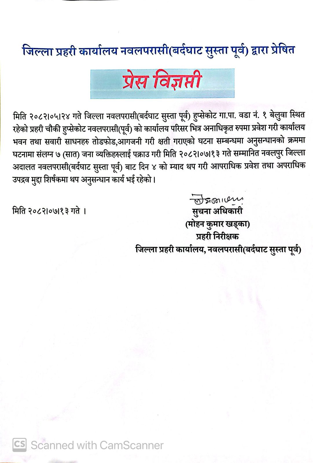 उनीहरूलाई नवलपुर जिल्ला अदालत (नवलपरासी बर्दघाट सुस्ता पूर्व) बाट चार दिनको म्याद थप गरी आपराधिक प्रवेश तथा आपराधिक उपद्रव मुद्दा शीर्षकमा थप अनुसन्धान भइरहेको जिल्ला प्रहरी कार्यालयले जनाएको छ।