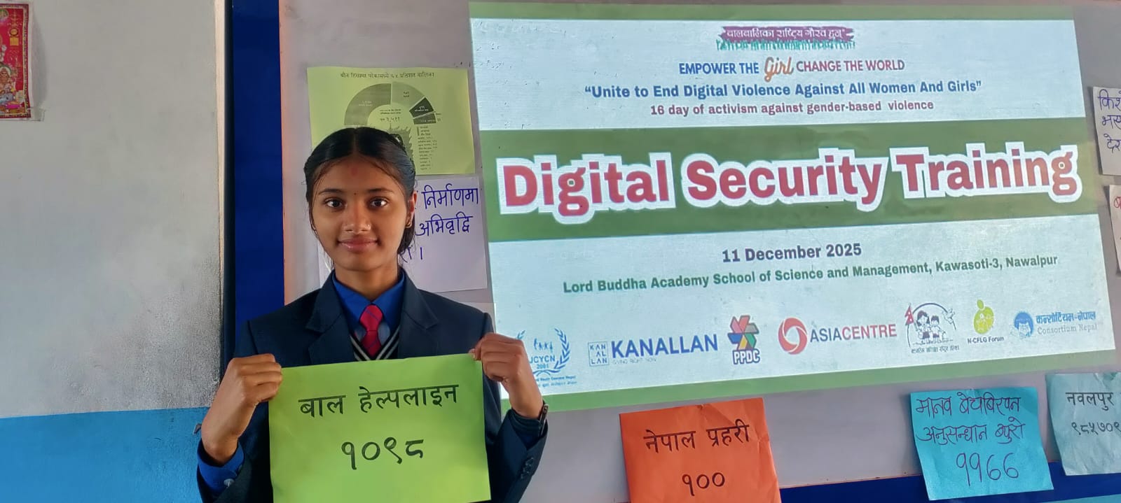 लैङ्गिक हिंसा विरुद्धको १६ दिने अभियानका अवसरमा कावासोती नगरपालिका-३ स्थित लर्ड बुद्ध एकेडेमी स्कुल अफ साइन्स एन्ड म्यानेजमेन्टमा डिजिटल सुरक्षा सम्बन्धी एक दिने तालिम सम्पन्न भएको छ। “सबै महिला र बालिकामाथि हुने डिजिटल हिंसा अन्त्य गर्न एकताबद्ध बनौँ” भन्ने अन्तर्राष्ट्रिय नारा तथा “प्रविधिको सही प्रयोग गरौँ, लैङ्गिक हिंसा अन्त्य गरौँ” भन्ने राष्ट्रिय नाराका साथ आयोजित उक्त तालिममा किशोर किशोरीलाई अनलाइन सुरक्षा तथा डिजिटल हिंसा न्यूनीकरणका विषयमा विस्तृत प्रशिक्षण प्रदान गरिएको थियो।