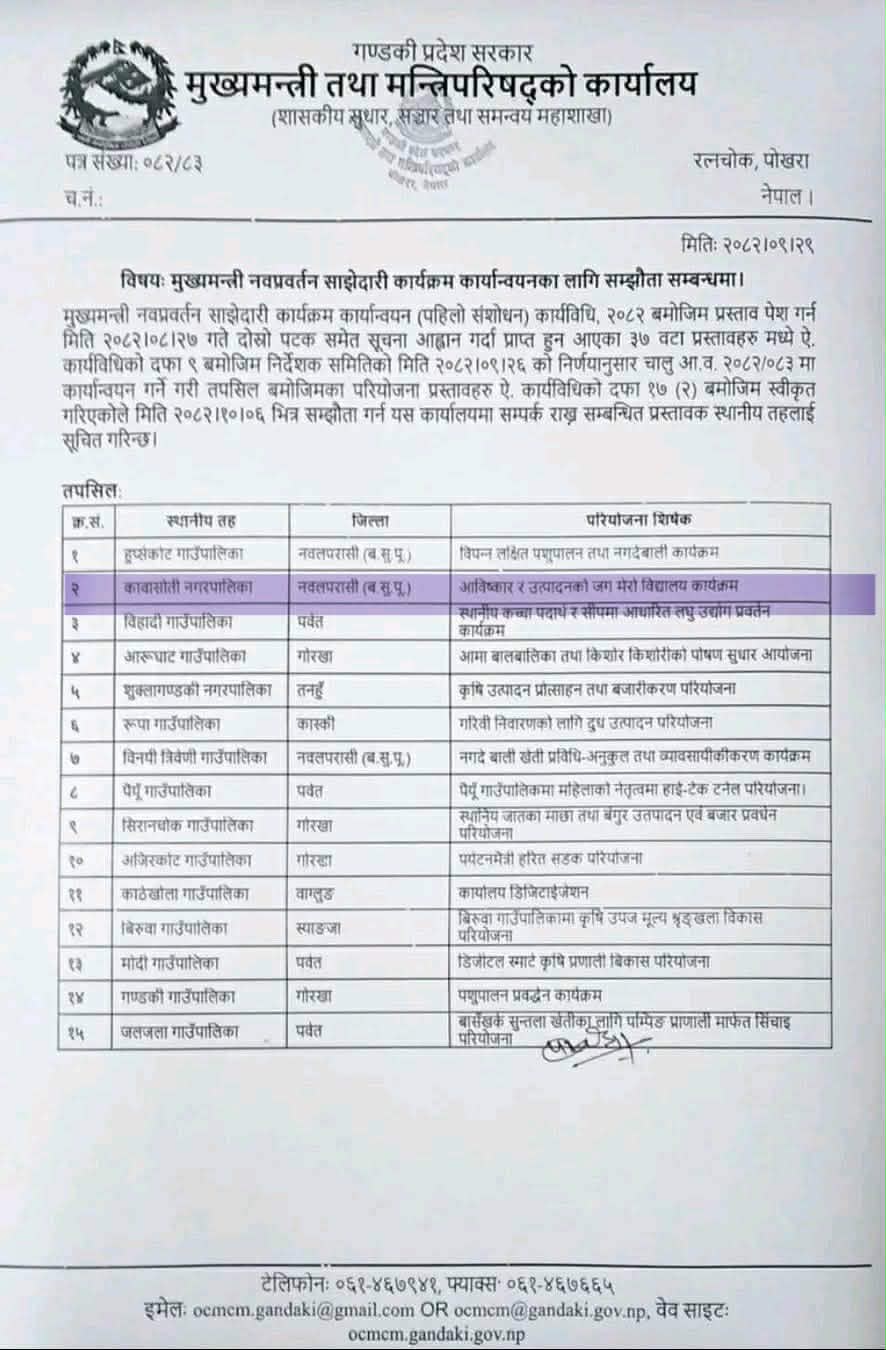 गण्डकी प्रदेश सरकारद्वारा सञ्चालन गरिएको मुख्यमन्त्री नवप्रवर्तन साझेदारी कार्यक्रमअन्तर्गत नवलपरासी (बर्दघाट सुस्तापूर्व) का तीन स्थानीय तहका नवप्रवर्तन परियोजना छनोट भएका छन् ।